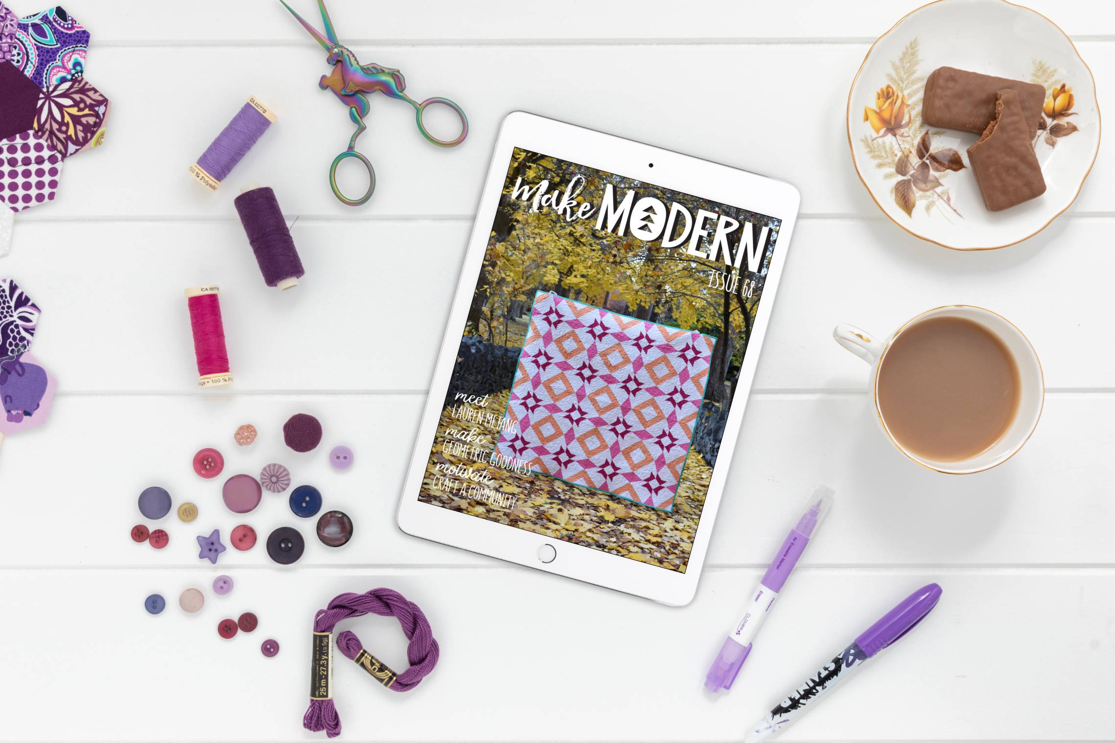 Hello Reader! The countdown is on! 14 more sleeps til the newest issue of Make Modern is gracing your screen! That's 14 more sleeps to start dreaming and planning for your next project. Issue 67 won't disappoint. Check out a lil sneak peek to see what's coming your way. Issue 67 has you covered for paper piecing, english paper piecing, hand stitching, traditional piecing and even some bright brilliant rainbows! There's a lil something for everyone waiting in the 100+ pages of our next issue....